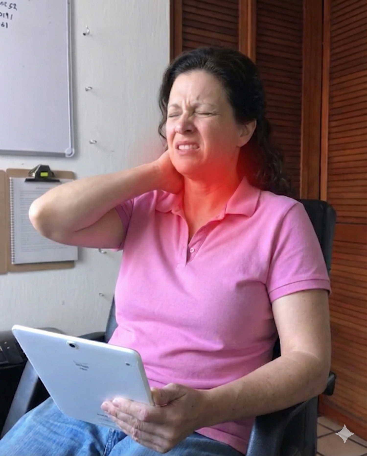 Modern mom life constantly pulls the head forward — looking down at your phone, helping kids, working on a laptop, cooking, cleaning, driving, and everything in between. Over time, these habits make the neck muscles tighten and overcompensate, leaving your neck stuck in that strained position all day.
